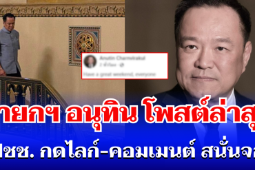 เมื่อวันที่ 18 เมษายน 2569 นายอนุทิน ชาญวีรกูล นายกรัฐมนตรี ได้โพสต์รูปภาพพร้อมกับข้อความสั้น ๆ ผ่านบัญชีเฟซบุ๊กส่วนตัว Anutin Charnvirakul โดยระบุว่า Have a great weekend, everyone ซึ่งแปลเป็นภาษาไทยได้ว่า ขอให้ทุกคนมีความสุขในวันหยุดสุดสัปดาห์ โพสต์ดังกล่าว ภายหลังโพสต์ดังกล่าวได้เผยเเพร่ออกไป งานนี้ทำเอาประชาชนแห่กันเข้ามากดไลก์กันอย่างล้นหลามกว่า 3 พันไลก์ พร้อมกับคอมเมนต์กันอย่างต่อเนื่องไม่ขาดสาย เรียบเรียง…