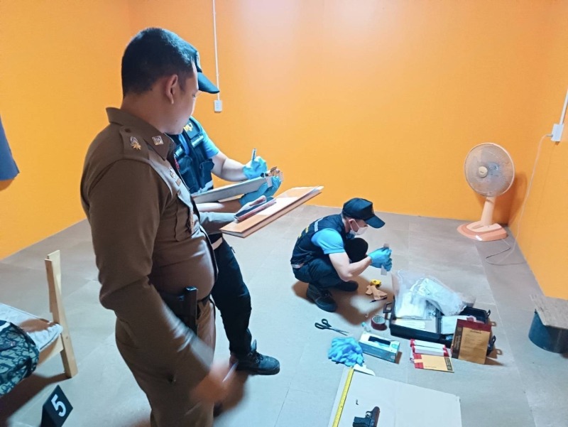 จากการตรวจสอบพบมีรูด้านขมับขวาช่วงเท้าด้านขวาพบอาวุธปืนสีดำแม็กกาชีน และปลอกกระสุน 1 ปลอกตกลงที่พื้น และพบอาวุรุปืน ยี่วอลเทอร์ สีดำ 380 ตกอยู่ข้างตัวผู้เสียชีวิต