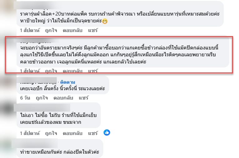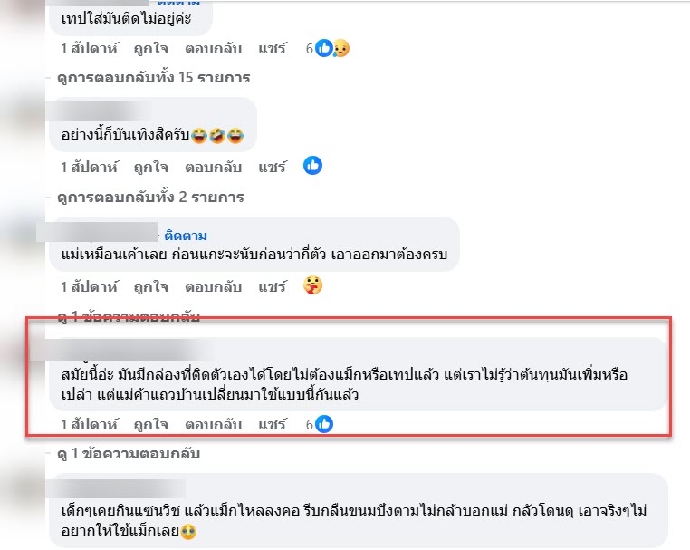 จากโพสต์นี้ก็มีหลายคนเข้ามาแสดงความคิดเห็นกันอย่างมากมาย ทั้งบอกว่า “สมัยนี้อ่ะ มันมีกล่องที่ติดตัวเองได้โดยไม่ต้องแม็กหรือเทปแล้ว แต่เราไม่รู้ว่าต้นทุนมันเพิ่มหรือเปล่า แต่แม่ค้าแถวบ้านเปลี่ยนมาใช้แบบนี้กันแล้ว”