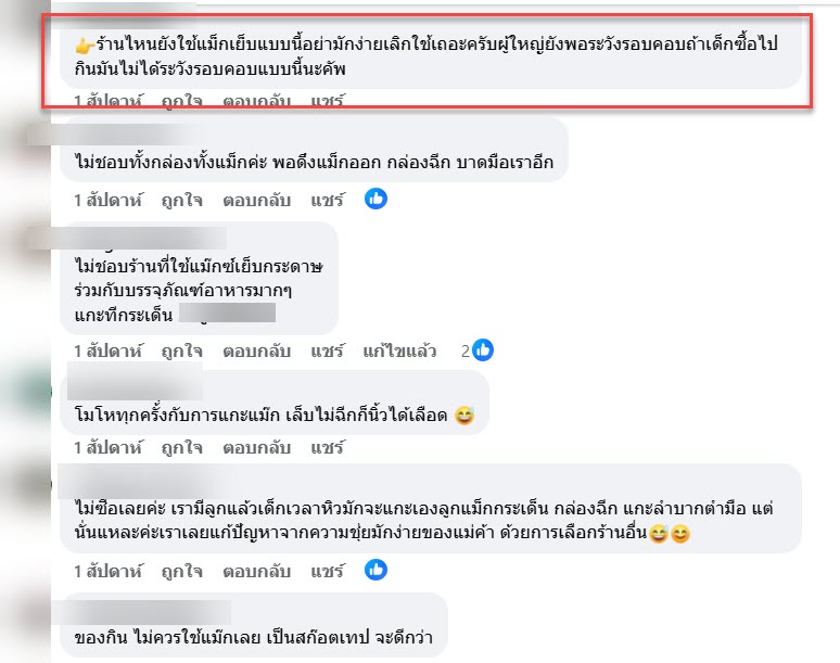 จากโพสต์นี้ก็มีหลายคนเข้ามาแสดงความคิดเห็น และบอกว่าร้านที่ใช้ลูกแม็กเย็บกล่องอาหาร มันดูมักง่ายและเสี่ยงกับผู้บริโภคจริงๆ