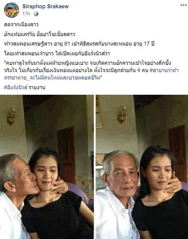 กลายเป็นกระเเสฮือฮาในโลกออนไลน์ กับเรื่องราวความรักของคู่รักชาวลาว ที่มีอายุห่างกัน60กว่าปี โดยฝ่ายชายเป็นเศรษฐีมากทรัพย์อายุกว่า 81ปี ส่วนฝ่ายหญิงเจ้าสาวนั้น มีอายุเเค่17ปีเท่านั้น เหมือนกับรุ่นปู่กับรุ่นหลาน เเต่ขึ้นชื่อว่าเรื่องของความรักสวยงามเสมอ รักไร้พรมเเดน อาจจะเป็นพรหมลิขิตที่ทำให้ทั้งคู่มาเจอกัน ฝ่ายหญิงยืนยันชัดเจน ที่ตกลงปลงในเเต่งงานไม่เกี่ยวกับเรื่องสมบัติเงินทอง