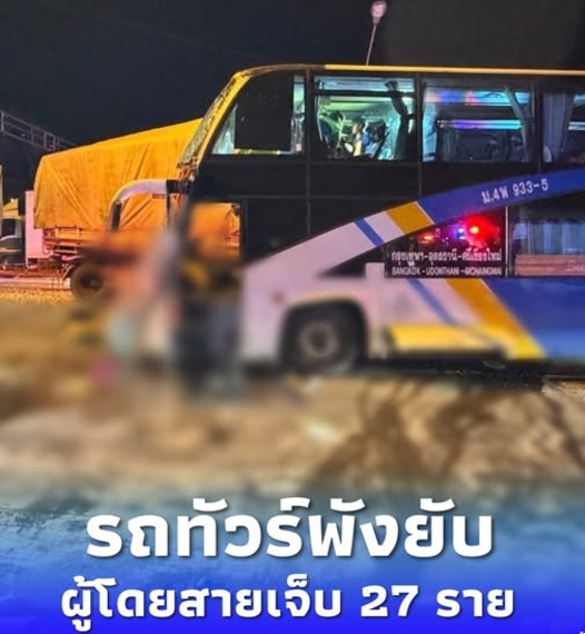 รถทัวร์ ชนท้ายรถบรรทุกหิน เปลี่ยนเลยกะทันหัน พังยับเจ็บ 27 คน