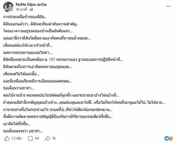 คุณหนูนาโพสต์ว่า “การช่วยเหลือช้างของดิฉัน.. ดิฉันบอกแล้วว่า.. ดิฉันจะเรียงลำดับความสำคัญ..โดยเอาความอยู่รอดของช้างเป็นอันดับแรก…แต่อย่านึกว่าดิฉันไม่คิดตามเอาผิดคนที่ทารุณช้างนะคะ…เพียงแต่ต้องให้เวลาเจ้าหน้าที่… แต่หากหน่วยงานละเลยไม่ทำ…