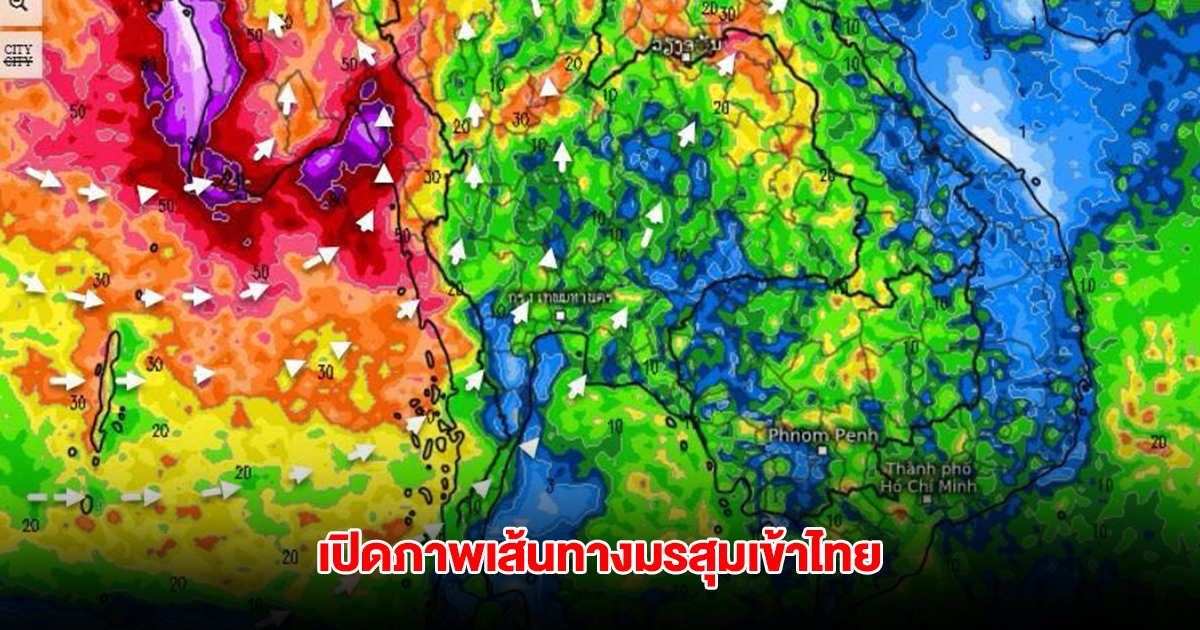 วันที่ 24 พ.ค. 68 กรมอุตุนิยมวิทยา อัพเดทผลการพยากรณ์ฝนสะสมรายวัน (ทุกๆ 24 ชม. (นับตั้งแต่ 07.00น. ถึง 07.00น.วันรุ่งขึ้น) และลมที่ระดับ 925hPa (750 ม.)15 วันล่วงหน้า ระหว่าง 24 พ.ค.- 7 มิ.ย.68 init. 2025052312 จากศูนย์พยากรณ์อากาศระยะกลางยุโรป (ECMWF) วิเคราะห์ตามผลจากแบบจำลองฯ เฉดสีแดงหมายถึงฝนหนัก สีเขียวหมายถึงฝนเล็กน้อย
