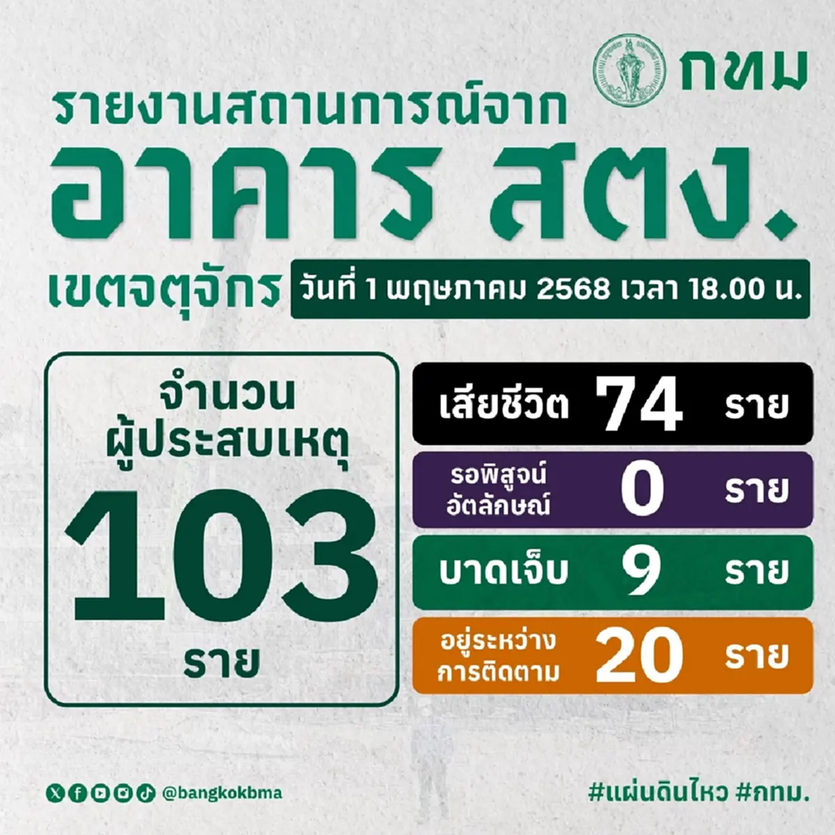 คืบหน้าตึกสตง.ถล่ม ซึ่งอัปเดตจากการเจอร่างผู้เสียชีวิตเพิ่มเมื่อเย็นวันที่ 1 พ.ค. 2568 นั้นพบว่า จากผู้ประสบภัย 103 ราย พบร่างผู้เสียชีวิต 74 ราย รอพิสูจน์อัตลักษณ์ 0 ราย มีผู้บาดเจ็บ 9 ราย และอยู่ระหว่างการค้นหา 20 ราย และทางเจ้าหน้าที่ได้ทยอยนำร่างผู้เสียชีวิตส่งคืนให้ครอบครัวเพื่อนำไปประกอบพิธีทางศาสนาแล้ว