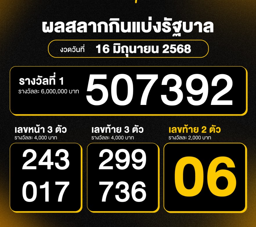 เรียกได้ว่าออกเป็นที่เรียบร้อยแล้ว สำหรับผลสลากกินแบ่งรัฐบาล งวดประจำวันที่ 16 มิถุนายน 2568 รางวัลที่ 1 รางวัลละ 6,000,000 บาท ออกหมายเลข 507392 เลขหน้า 3 ตัว 2 รางวัล รางวัลละ 4,000 บาท ออกหมายเลข 243 017