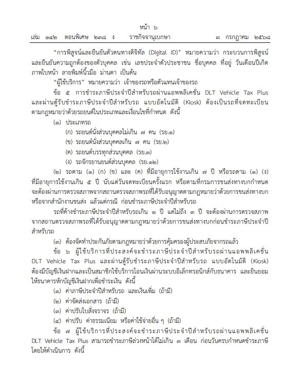 ข้อ 6 ผู้ใช้บริการที่ประสงค์จะชำระภาษีประจำปีสำหรับรถผ่านแอปพลิเคชัน DLT Vehicle Tax Plus และผ่านตู้รับชำระภาษีประจำปีสำหรับรถแบบอัตโนมัติ (Kiosk) ต้องมีบัญชีเงินฝากและเป็นสมาชิกใช้บริการโอนเงินผ่านระบบอิเล็กทรอนิกส์กับธนาคาร และยินยอมให้ธนาคารหักบัญชีเงินฝากเพื่อชำระเงิน ดังนี้