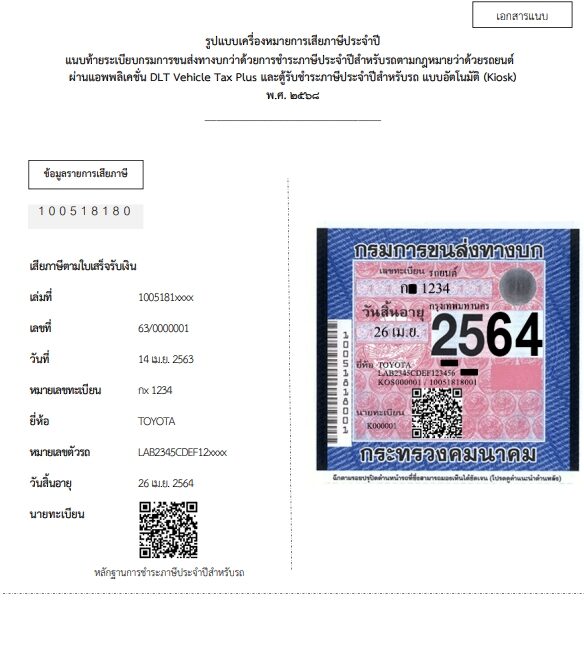 โดยระบุว่า ตามที่ได้มีระเบียบกรมการขนส่งทางบกว่าด้วยการชำระภาษีรถประจำปีตามกฎหมายว่าด้วยรถยนต์ผ่านตู้รับชำระภาษีรถประจำปีอัตโนมัติ (Kiosk) และแอปพลิเคชั่น DLT Vehicle Tax พ.ศ. 2563 ไว้แล้วนั้น