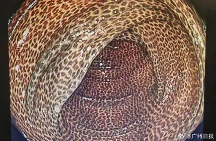 แต่ไม่นานมานี้ อาการท้องผูกกลับมาอีกครั้ง แถมเริ่มมีอาการแน่นท้องและปวดท้องร่วมด้วย ทำให้คุณหวังตัดสินใจไปพบแพทย์ที่โรงพยาบาลหมายเลข 1 เมืองหางโจว หลังจากทำการส่องกล้องตรวจระบบทางเดินอาหาร แพทย์ต้องตกใจเมื่อพบว่าผนังลำไส้ของผู้ป่วยมีลวดลายสีเข้มแต้มกระจายทั่ว คล้ายลาย “หนังงู” ซึ่งไม่ใช่สิ่งปกติในร่างกายมนุษย์
