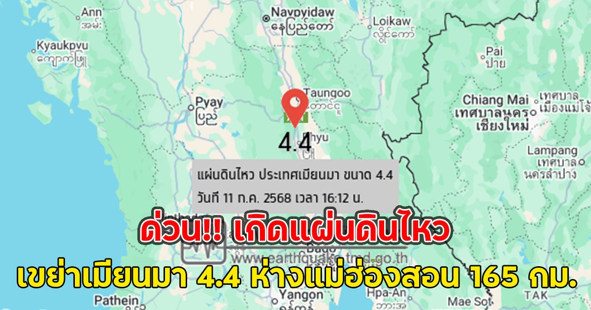 วันที่ 11 กรกฎาคม กองเฝ้าระวังแผ่นดินไหว กรมอุตุนิยมวิทยา รายงานเหตุแผ่นดินไหว ขนาด 4.4 ลึก 10 กม. ศูนย์กลางประเทศเมียนมา ทางทิศตะวันตกเฉียงใต้ของ อ.ขุนยวม จ.แม่ฮ่องสอน ประมาณ 165 กม.