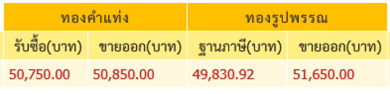 สมาคมค้าทองคำประกาศราคาขายทองคำในประเทศไทย ปิดสัปดาห์ ปรับลดลง -250 บาท ทองคำแท่งรับซื้อ 50,750 บาท ราคาขายออก 50,850 บาท ด้านทองรูปพรรณรับซื้อ 49,830.92 บาท ราคาขายออก 51,650 บาท ส่งผลเป็นราคาทองคำต่ำสุดในรอบ 23 วันผ่านมา หรือในรอบ 2 สัปดาห์กว่า หรือตั้งแต่วันที่ 11 เมษายน 2025 นอกจากนี้ ยังเป็นราคาทองคำแท่งหลุดระดับ 51,000 บาท และทองรูปพรรณรับซื้อมีราคาหลุดต่ำกว่า 50,000 บาทเป็นครั้งแรกในรอบ 3 สัปดาห์กว่า