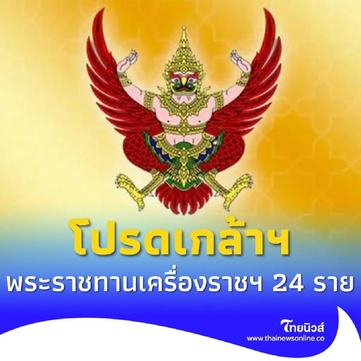 วันที่ 24 ก.ค. 2568 เว็บไซต์ราชกิจจานุเบกษา เผยแพร่ประกาศพระบรมราชโองการโปรดเกล้าฯ พระราชทานเครื่องราชอิสริยาภรณ์จุลจอมเกล้า เครื่องราชอิสริยาภรณ์อันเป็นที่เชิดชูยิ่งช้างเผือก เครื่องราชอิสริยาภรณ์อันมีเกียรติยศยิ่งมงกุฎไทย และเหรียญรัตนาภรณ์