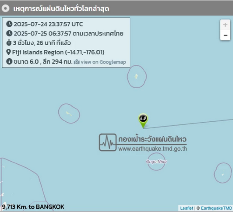 2025-07-25 00:41:50 | แรงสั่นสะเทือนขนาด 2.1 แมกนิจูด ลึกลงไปใต้พื้นดิน 10 กิโลเมตร ศูนย์กลาง ประเทศเมียนมา ทางทิศตะวันตกเฉียงเหนือของ อ.ปางมะผ้า จ.แม่ฮ่องสอน ประมาณ 82 กม.