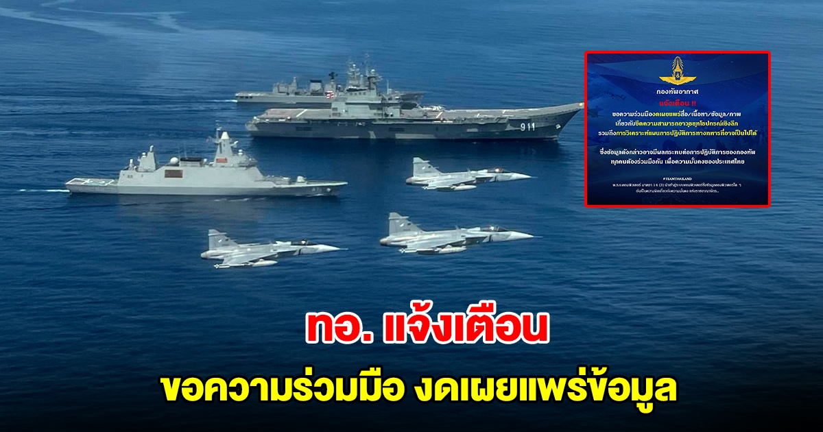 ล่าสุด แฟนเพจ กองทัพอากาศไทย Royal Thai Air Force โพสต์ข้อความว่า แจ้งเตือน!! ขอความร่วมมืองดเผยแพร่สื่อ/เนื้อหา/ข้อมูล/ภาพ เกี่ยวกับขีดความสามารถอาวุธยุทโธปกรณ์เชิงลึก รวมถึงการวิเคราะห์แผนการปฏิบัติการทางทหารที่อาจเป็นไปได้