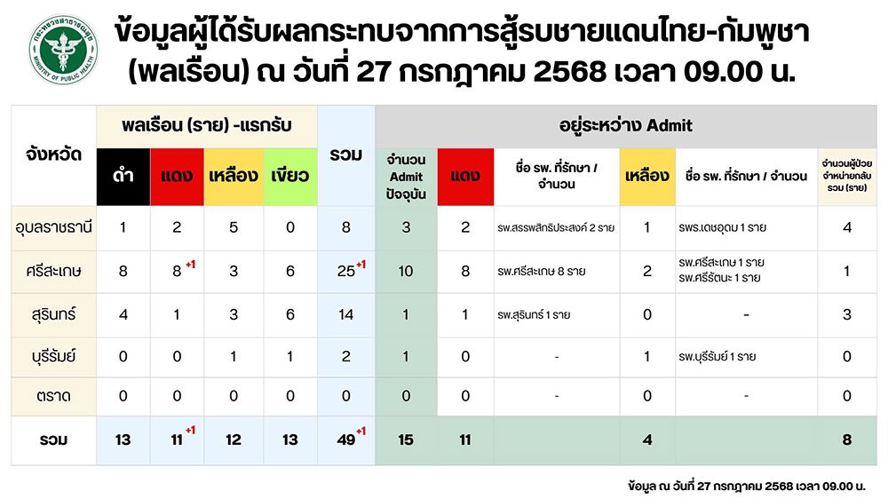 ส่วน รพ. ได้รับผลกระทบรวม 19 แห่ง ต้องปิดให้บริการเพิ่มขึ้นอีก 4 แห่ง ได้แก่ รพ.นาจะหลวย จ.อุบลราชธานี, รพ.บัวเชด รพ.สังขะ จ.สุรินทร์ และ รพ.เฉลิมพระเกียรติ จ.บุรีรัมย์ รวมปิดให้บริการ 11 แห่ง ลดบริการเหลือเฉพาะฉุกเฉิน (ER) เพิ่มอีก 1 แห่ง คือ รพ.ละหานทราย จ.บุรีรัมย์ รวมเปิดบริการเฉพาะฉุกเฉิน 8 แห่ง ต้องเคลื่อนย้ายผู้ป่วย 617 ราย มีการเปิดศูนย์อพยพเพิ่มเป็น 433 แห่ง มีผู้เข้าพัก 138,152 คน เป็นกลุ่มเปราะบาง 21,076 คน ส่งต่อผู้อพยพไปรักษาในโรงพยาบาล 139 ราย
