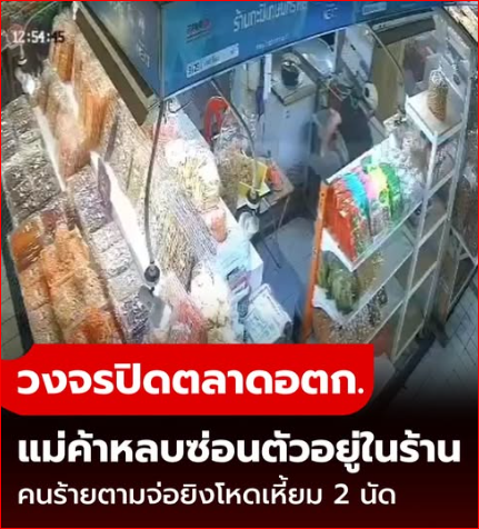 วงจรปิดจับภาพ แม่ค้าตลาด อตก. หลบซ่อนตัวในร้าน ถูกคนร้ายตามจ่อยิงอย่างโหดเหี้ยม 2 นัด ไม่สนคำอ้อนวอน