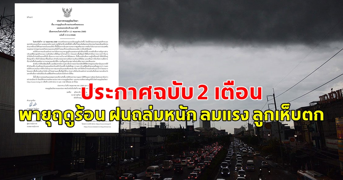 วันที่ 8 พ.ค.2568 กรมอุตุนิยมวิทยา ประกาศ เรื่อง พายุฤดูร้อนบริเวณประเทศไทยตอนบน และฝนตกหนักบริเวณภาคใต้ (มีผลกระทบในช่วงวันที่ 9-12 พฤษภาคม 2568) ฉบับที่ 2 (111/2568) ระบุว่า ในช่วงวันที่ 9-12 พฤษภาคม 2568 ประเทศไทยตอนบนจะมีพายุฤดูร้อนเกิดขึ้น โดยมีลักษณะของพายุฝนฟ้าคะนอง ลมกระโชกแรง ลูกเห็บตก และฝนตกหนักบางแห่ง รวมถึงฟ้าผ่าที่อาจเกิดขึ้นได้บางพื้นที่