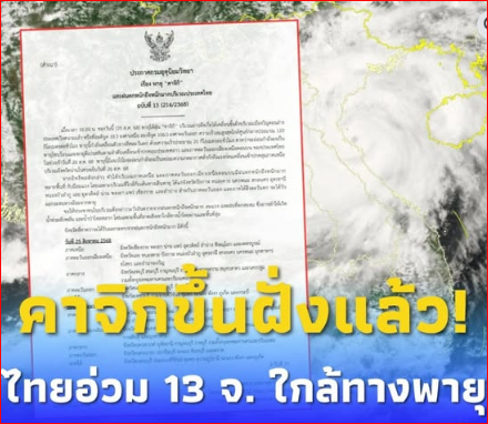 กรมอุตุนิยมวิทยาเผยแพร่ประกาศเตือนภัยฉบับที่ 13 “พายุไต้ฝุ่นคาจิกิ” เคลื่อนขึ้นฝั่งแล้ว พร้อมเปิดรายชื่อจังหวัดได้รับผลกระทบฝนตกหนักมาก