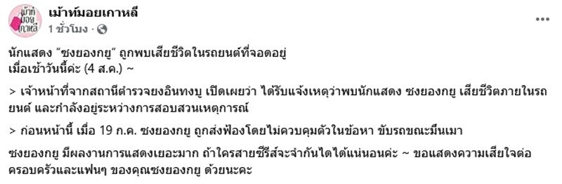 ก่อนหน้านี้ เมื่อ 19 ก.ค. ซงยองกยู ถูกส่งฟ้องโดยไม่ควบคุมตัวในข้อหา ขับรถขณะมึนเมา ซงยองกยู มีผลงานการแสดงเยอะมาก ถ้าใครสายซีรีส์จะจำกันได้แน่นอนค่ะ ขอแสดงความเสียใจต่อครอบครัวและแฟนๆ ของคุณซงยองกยู ด้วยนะคะ”