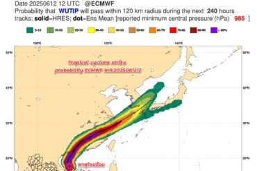 วันที่ 13 มิ.ย. 68 กรมอุตุนิยมวิทยา ประกาศเรื่องพายุ “หวู่ติบ” บริเวณทะเลจีนใต้ตอนบน ฉบับที่ 12 (146/2568) ระบุว่า เมื่อเวลา 04.00 น. ของวันนี้ (13 มิ.ย.) พายุโซนร้อน “หวู่ติบ” บริเวณทะเลจีนใต้ตอนบนได้ทวีกำลังแรงขึ้นเป็นพายุโซนร้อนกำลังแรงแล้ว 95 kt] 140°E 10°N””…