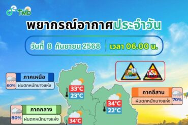 วันที่ 8 ก.ย. 2568 พยากรณ์อากาศ 24 ชั่วโมงข้างหน้า ประเทศไทยมีฝนตกหนักบางแห่ง และมีฝนตกหนักมากบางพื้นที่ในกรุงเทพมหานครและปริมณฑล และภาคตะวันออก บริเวณจังหวัด นครนายก ปราจีนบุรี ระยอง จันทบุรี และตราด ขอให้ประชาชนในบริเวณดังกล่าวระวังอันตรายจากฝนตกหนักถึงหนักมากและฝนที่ตกสะสม ซึ่งอาจทำให้เกิดน้ำท่วมขัง น้ำรอการระบายโดยเฉพาะบริเวณชุมชนเมือง เช่น กรุงเทพมหานครและปริมณฑล รวมทั้งระวังน้ำท่วมฉับพลันและน้ำป่าไหลหลาก โดยเฉพาะพื้นที่ลาดเชิงเขาใกล้ทางน้ำไหลผ่านและพื้นที่ลุ่ม เนื่องจากร่องมรสุมพาดผ่านภาคเหนือตอนล่าง ภาคกลางตอนบน และภาคตะวันออกเฉียงเหนือ ประกอบกับมรสุมตะวันตกเฉียงใต้กำลังปานกลางยังคงพัดปกคลุมทะเลอันดามัน…