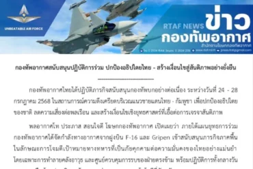 ทัพฟ้า ยืนหยัด เพื่อชาติไทย กองทัพอากาศสนับสนุนปฏิบัติการร่วม ปกป้องอธิปไตยไทย – สร้างเงื่อนไขสู่สันติภาพอย่างยั่งยืน กองทัพอากาศไทยได้ปฏิบัติภารกิจสนับสนุนกองทัพบกอย่างต่อเนื่อง ระหว่างวันที่ 24 – 28 กรกฎาคม 2568 ในสถานการณ์ความตึงเครียดบริเวณแนวชายแดนไทย – กัมพูชา เพื่อปกป้องอธิปไตยของชาติ ลดความเสี่ยงต่อพลเรือน และสร้างเงื่อนไขเชิงยุทธศาสตร์ที่เอื้อต่อการเจรจาสันติภาพ ภายใต้แผนยุทธการร่วม กองทัพอากาศได้จัดกำลังทางอากาศจากฝูงบิน F-16 และ Gripen เข้าสนับสนุนภารกิจภาคพื้นในลักษณะการโจมตีเป้าหมายทางทหารที่เป็นภัยคุกคามต่อความมั่นคงของไทยอย่างแม่นยำ…