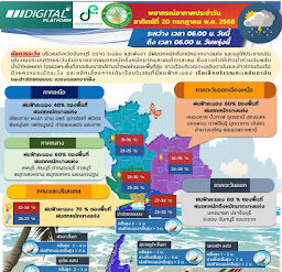 วันที่ 20 กรกฎาคม 2568 กรมอุตุนิยมวิทยา พยากรณ์อากาศ 24 ชั่วโมงข้างหน้า บริเวณจังหวัดจันทบุรี ตราด ระนอง และพังงา มีฝนตกหนักถึงหนักมากบางแห่ง ส่วนภาคกลาง และภาคตะวันออกเฉียงเหนือ มีฝนตกหนักบางพื้นที่ ขอให้ประชาชนในบริเวณดังกล่าวระวังอันตรายจากฝนตกหนักถึงหนักมากและฝนที่ตกสะสม ซึ่งอาจทำให้เกิดน้ำท่วมฉับพลัน น้ำป่าไหลหลาก โดยเฉพาะพื้นที่ลาดเชิงเขาใกล้ทางน้ำไหลผ่านและพื้นที่ลุ่ม ทั้งนี้เนื่องจากมรสุมตะวันตกเฉียงใต้ที่พัดปกคลุมทะเลอันดามัน ประเทศไทย และ อ่าวไทยมีกำลังค่อนข้างแรง สำหรับคลื่นลมบริเวณทะเลอันดามันตอนบนมีกำลังแรงขึ้น…